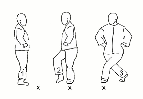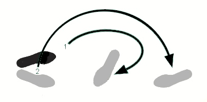 .........This is an example of a pendular rotation.  The left foot moves in a circular step to a point (x), forward, as the upper body rotates 180 degrees clockwise and faces the starting point.  Then the right foot describes a large half circle and stops at a point on horse behind the left foot.  At this point, the fighter is in a left cross stance facing the starting point.  This pattern is called a progressive pivot.  This is an example of pendular rotation.  The body rotates around the left foot which bears the full weight of the body.